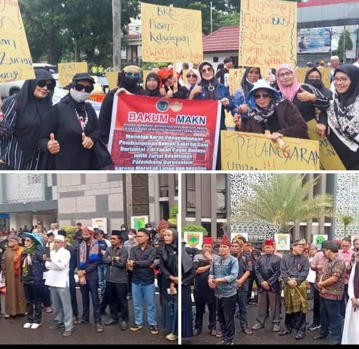 Palembang, Sumselpost.co.id — Gabungan Zuriyat Kesultanan Palembang Darussalam, Badan Advokasi Konsultasi dan Bantuan Hukum (BAKUM), Majelis Adat Kerajaan Nusantara (MAKN), serta sejumlah elemen masyarakat menggelar aksi damai menuntut relokasi Rumah Sakit AK Gani dari kawasan Benteng Kuto Besak (BKB), Jumat (12/12/2025).