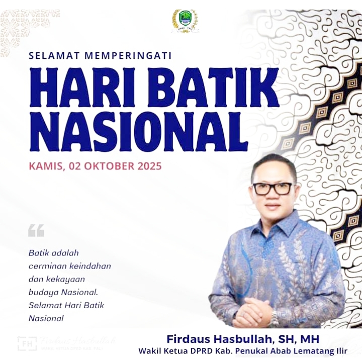 “Selamat memperingati Hari Batik Nasional 2025 Mari masyarakat untuk terus menjaga, melestarikan,dan mengembangkan batik sebagai jati diri bangsa,”pungkas Wakil Ketua DPRD Pali Firdaus Hasbulah SH MH (02/10/2025).(jn.red)