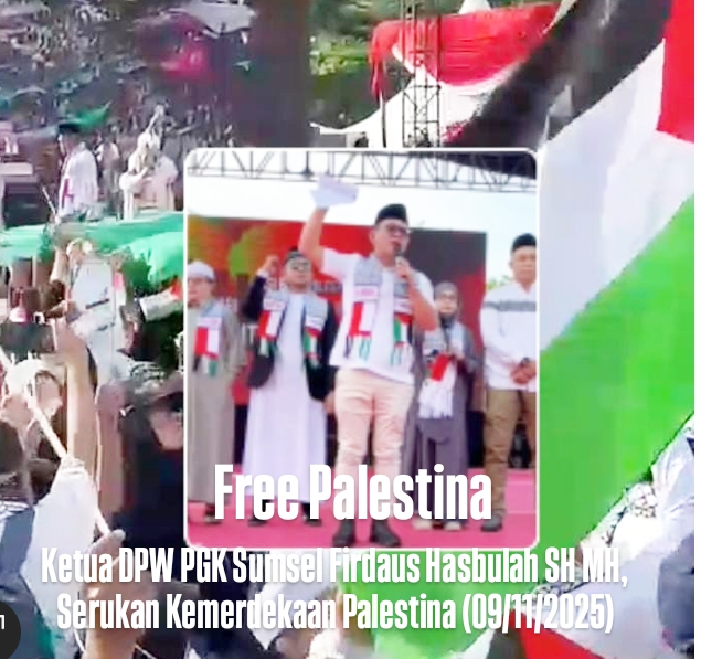 Palembang Sumselpost.co.id – Dalam gelar aksi dan orasi bela Palestina, Bebaskan Palestina atau Palestina Merdeka yang dihadiri ribuan orang (umat.red) dihalaman Menpora Kota Palembang pada Minggu (09/11/2025) Ketua Dewan Pimpinan Wilayah (DPW) Perkumpulan Gerakan Kebangsaan (PGK) Provinsi Sumatera Selatan (Sumsel) Firdaus Hasbulah SH MH, melalui pernyataan sikapnya mengungkapkan dengan tegas, bahwa kami dari Perkumpulan Gerakan Kebangsaan (PGK) Sumatera Selatan menyatakan sikap mendukung perjuangan kemerdekaan Palestina dari penjajahan Israel. “Free Palestina,” teriak Ketua DPW PGK Sumsel Firdaus Hasbulah dengan berapi-api tersebut.