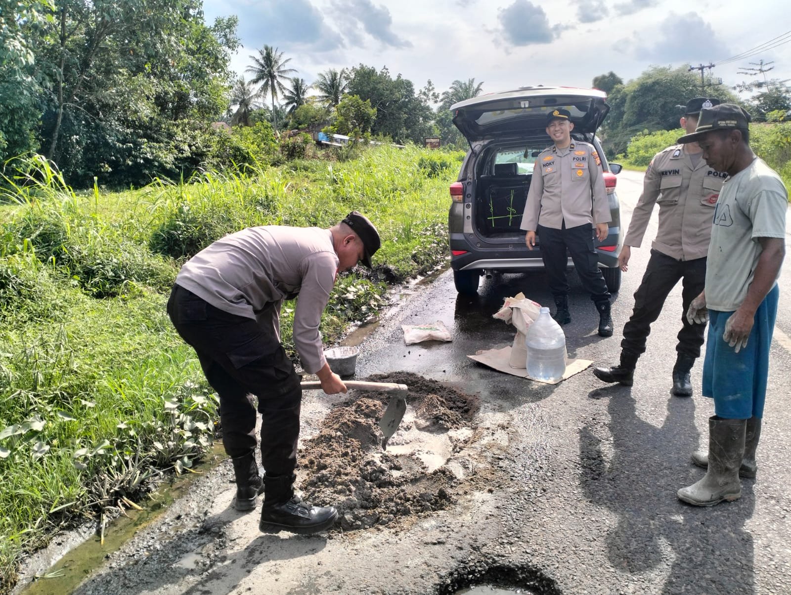 Kapolsek Lembak Polres Muara Enim Iptu Yopi Maswan, SH, didampingi personil Polsek Lembak Ipda Noki Juliawan, SH, Bripka Erwin, Brigpol Kevin, dan Briptu Fajeriansyah, secara langsung terpantau melaksanakan kegiatan penambalan jalan berlubang pada titik-titik rawan kecelakaan di sepanjang jalan lintas Palembang -Prabumulih tepatnya didesa Lembak guna meminimalisir potensi terjadinya kecelakaan lalulintas serta meningkatkan keselamatan pengguna jalan.