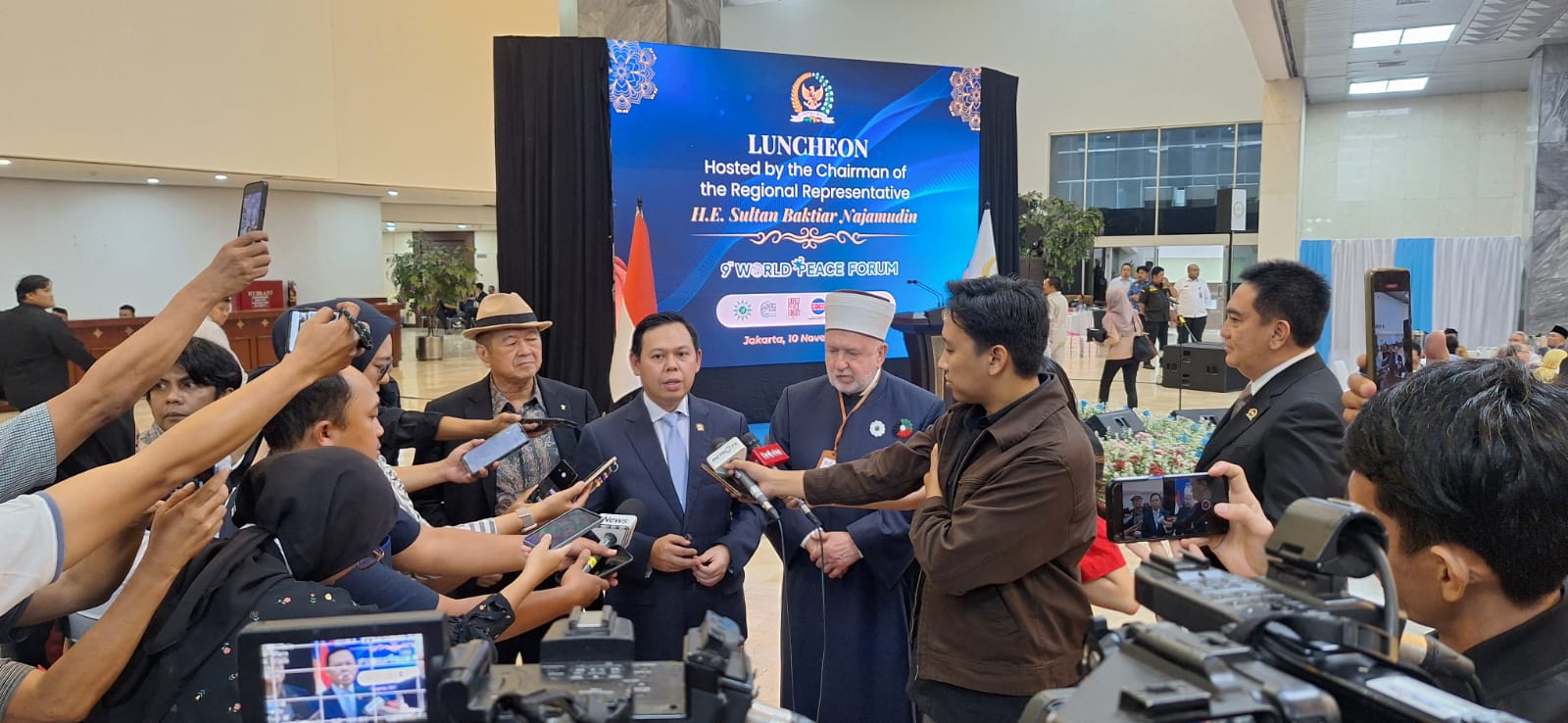 “Kita mau tunjukkan bahwa Indonesia itu harmonis, kita contoh dalam unity in diversity, seperti dalam semboyan Bhinneka Tunggal Ika yang ingin kita angkat. Saya baca sejarah, berkunjung ke banyak negara, tidak ada negara yang seunik Indonesia, dengan multi etnis, puluhan ribu pulau, suku, budaya, dan agama, tetapi tetap harmonis. Itu pesan pentingnya,” tegas Ketua DPD RI Sultan B Najamudin saat menjadi tuan rumah Luncheon World Peace Forum (WPF) ke-9 di Lobby Nusantara V, MPR RI/DPD RI Senayan Jakarta, Senin (10/11/2025).