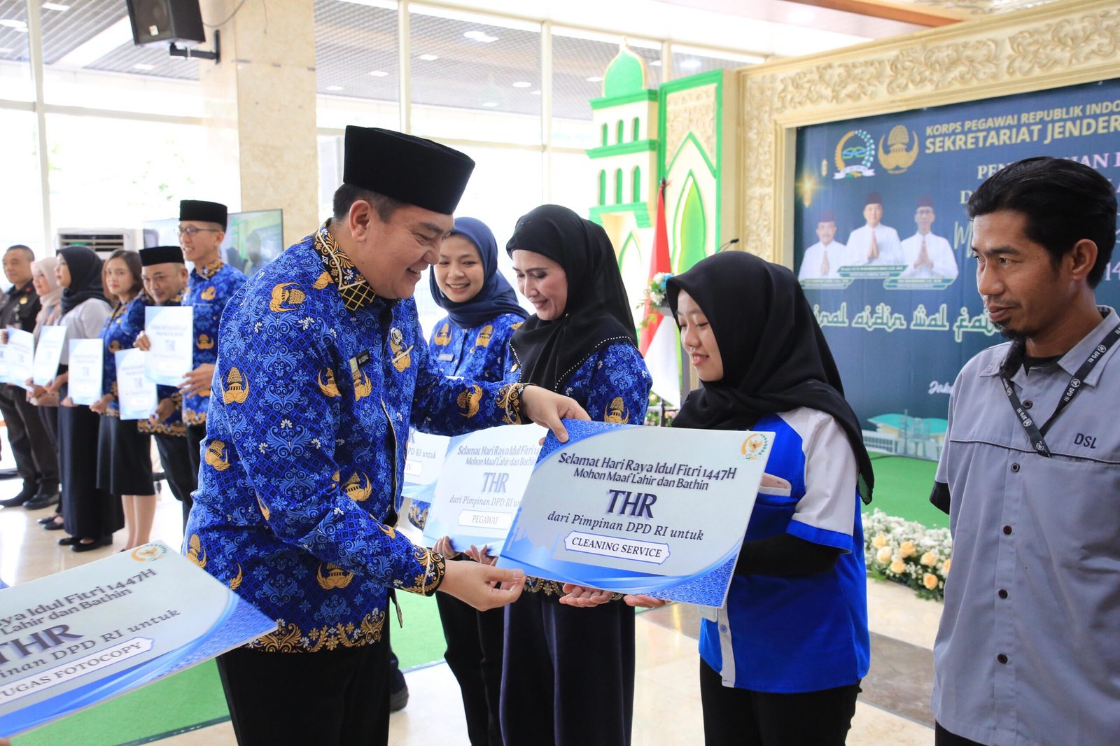 Dalam rangka menyambut Hari Raya Idul Fitri 1447 Hijriah, KORPRI Setjen DPD RI menyalurkan bingkisan Hari Raya dalam bentuk voucher belanja kepada pegawai dan staf pendukung. Total bingkisan yang disalurkan sebanyak 1.626 voucher, dengan rincian 1.408 voucher diberikan kepada pejabat dan pegawai Aparatur Sipil Negara (ASN), Calon Pegawai Negeri Sipil (CPNS), serta Pegawai Pemerintah Non Pegawai Negeri (PPNPN), dan 218 voucher diberikan kepada staf pendukung yang selama ini turut membantu kelancaran pelaksanaan tugas di lingkungan Sekretariat Jenderal DPD RI. (MM)