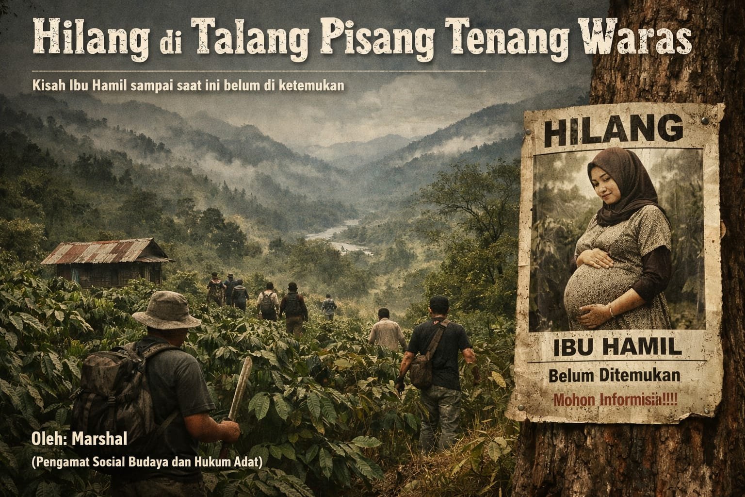 Di perbukitan aliran Sungai Enim, tepatnya di lembah Pegunungan Tumutan Tujuh Bukit Barisan, wilayah Semende Darat Laut, Kabupaten Muara Enim, Sumatera Selatan, terbentang areal perkebunan kopi yang dikenal masyarakat setempat dengan sebutan Tenang Waras. Selain menjadi sumber penghidupan warga, kawasan ini juga menyimpan kisah pilu tentang hilangnya seorang perempuan hamil yang hingga kini tak pernah ditemukan.