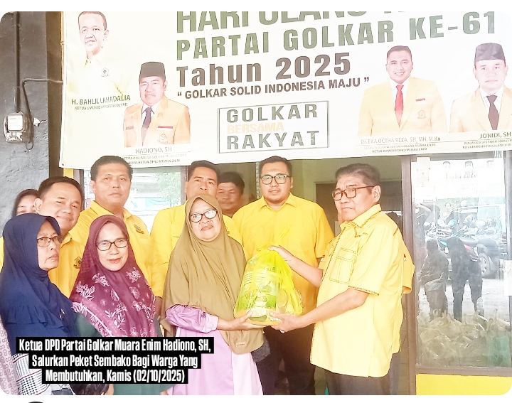 “Semoga melalui penyaluran paket sembako dalam rangka HUT Partai Golkar Ke-61, menjadikan semangat untuk terus memperjuangkan aspirasi masyarakat, serta ucapan selamat kepada warga yang menerimanya untuk dimanfaatkan sebaik-baiknya,” ungkap ketua DPD Partai Golkar Kabupaten Muara Enim Hadiono, SH, di Kantor Sekretariat DPD Partai Golkar Muara Enim tersebut, Kamis (02/10/2025).