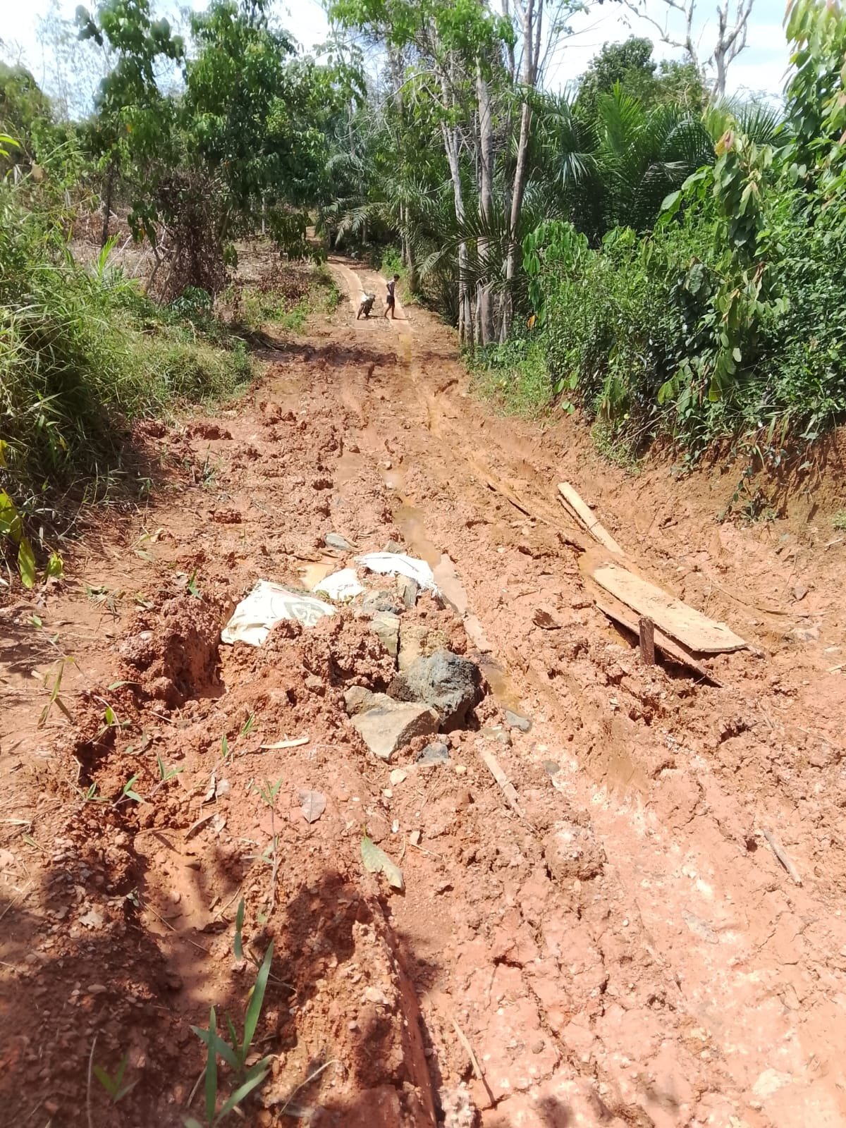 Warga terpaksa melakukan upaya darurat dengan menyusun papan dan batu agar tetap bisa melintas. Kondisi ini dinilai sangat mengganggu aktivitas petani, terutama dalam mengangkut hasil kebun.
