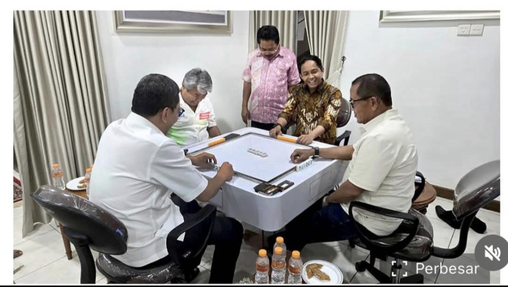 Mereka berdua terlihat cukup akrab. Bahkan, di meja yang sama, ada dua orang lain yang ikut bermain, menambah kesan suasana santai dan penuh keakraban.