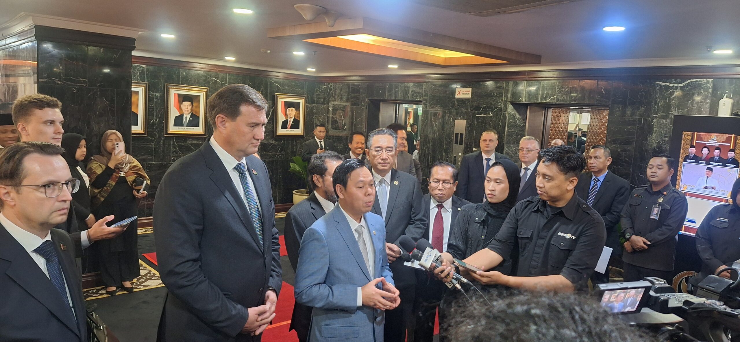 Wakil Ketua DPD Yorrys Raweyai dan sejumlah anggota DPD RI saat menerima kunjungan kehormatan rombongan Menteri Luar Negeri Belarus Maxim Ryzhenkov dan jajarannya tersebut.