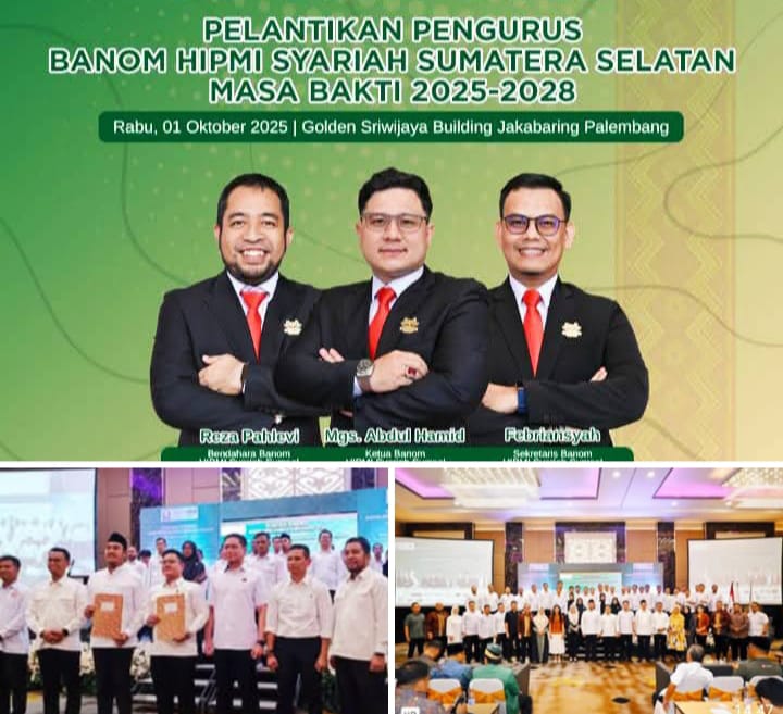 Palembang, Sumselpost.co.id – Himpunan Pengusaha Muda Indonesia (HIPMI) Syariah Sumatera Selatan resmi melantik pengurus baru masa bakti 2025–2028. Acara pelantikan yang berlangsung meriah tersebut digelar di Golden Sriwijaya Building, Jakabaring, Palembang, pada Rabu (1/10/2025).