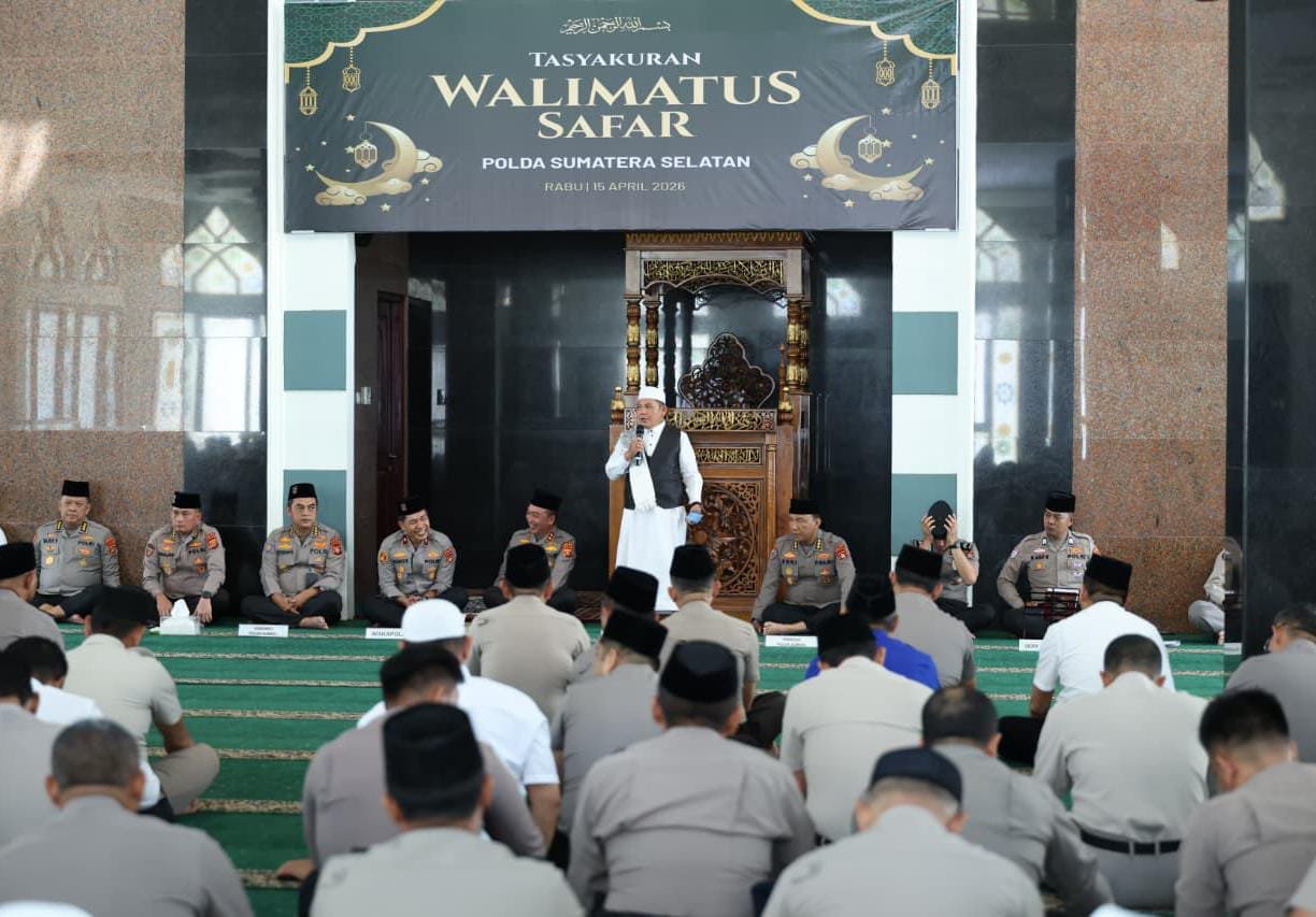 Palembang Sumselpost.co.id -Kapolda Sumatera Selatan Irjen Pol Dr. Sandi Nugroho, S.I.K., S.H., M.Hum. menegaskan bahwa penguatan mental spiritual merupakan fondasi utama dalam membentuk personel Polri yang profesional, berintegritas, dan humanis. Penegasan tersebut disampaikan saat memimpin kegiatan Tasyakuran Walimatussafar bagi keluarga besar Polda Sumsel yang akan menunaikan ibadah haji musim 1447 H / 2026 M di Masjid Assa’adah Mapolda Sumsel, Rabu (15/4/2026).