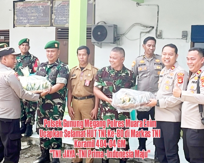 Kapolsek Gunung Megang Polres Muara Enim Iptu Kemas Erwin SH, MH, didampingi Wakapolsek Gunung Megang. Ipda Ely Suyono, Kanit Reskrim Ipda Robert, SE, dak beserta jajarannya, mengungkapkan, bahwa kunjungannya ke Markas TNI Koramil 404-01 Gunung Megang selain memberikan ucapan selamat HUT TNI Ke-80, juga sekaligus mempererat ikatan silaturahmi yang selama ini telah terjalin melalui jalinan bentuk sinergitas yang telah terbangun selama ini dengan baik.