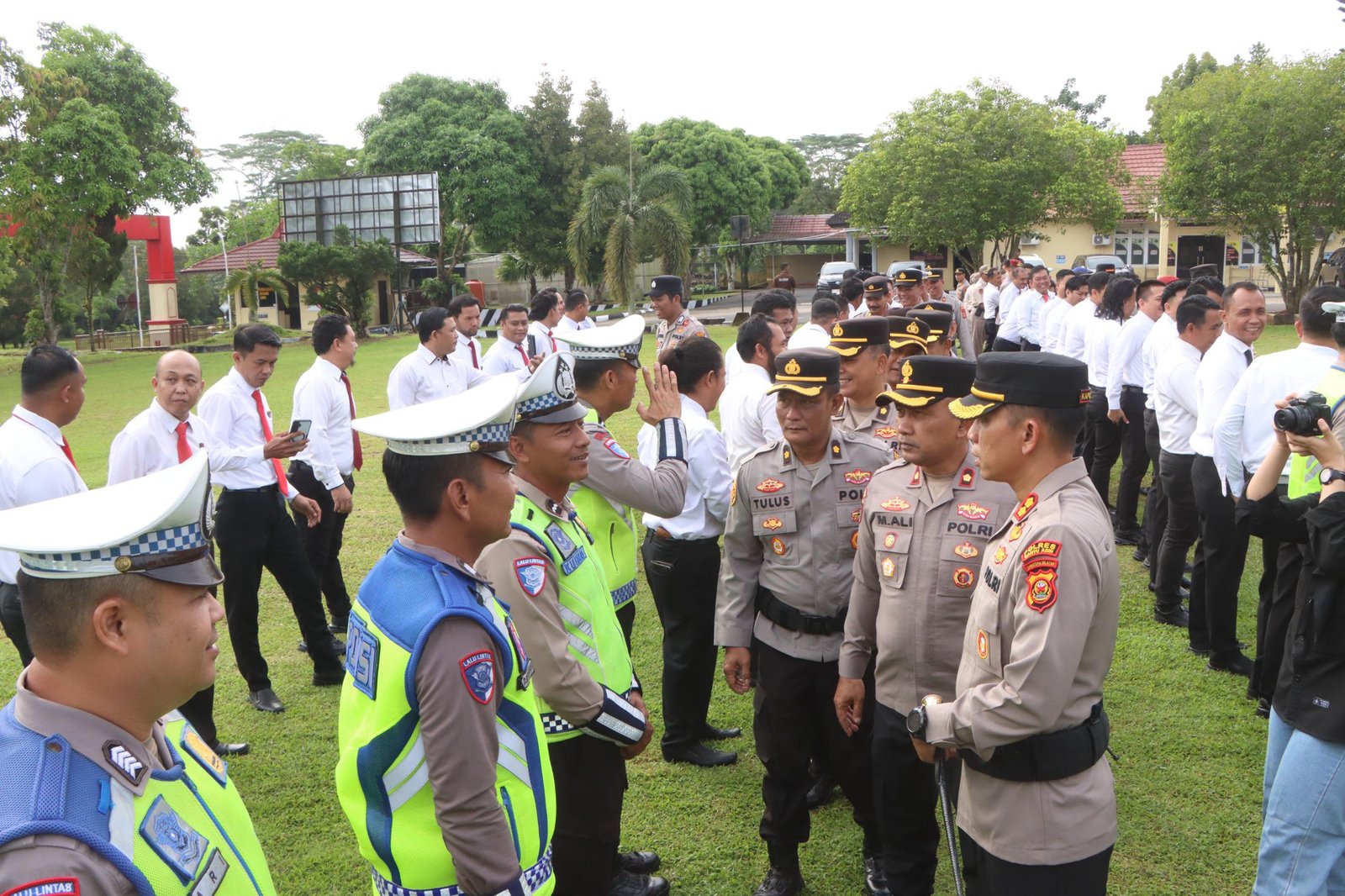 Usai apel resmi selesai, suasana berubah menjadi lebih hangat dan penuh kebersamaan. Seluruh personel Polres Banyuasin, mulai dari perwira, bintara, hingga pegawai negeri sipil (PNS) di lingkungan Polres Banyuasin, bersama-sama mengikuti rangkaian Halal Bihalal.