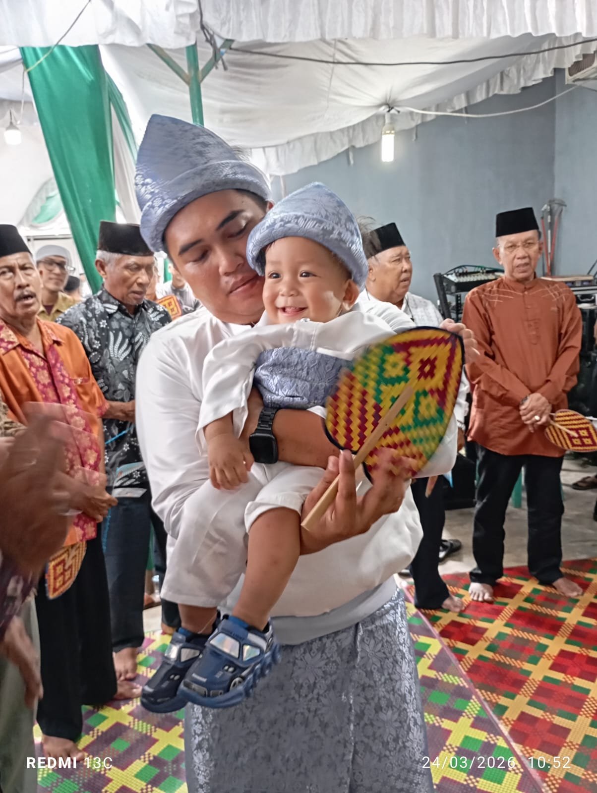 Rangkaian acara berlangsung khidmat, diawali dengan pembacaan ayat suci Al-Qur’an, dilanjutkan dengan kata sambutan, pembacaan Surah Yasin, Marhabah, prosesi pemberian nama, serta pencukuran rambut yang dilakukan oleh sang kakek dan para sesepuh keluarga. Acara kemudian ditutup dengan doa bersama.